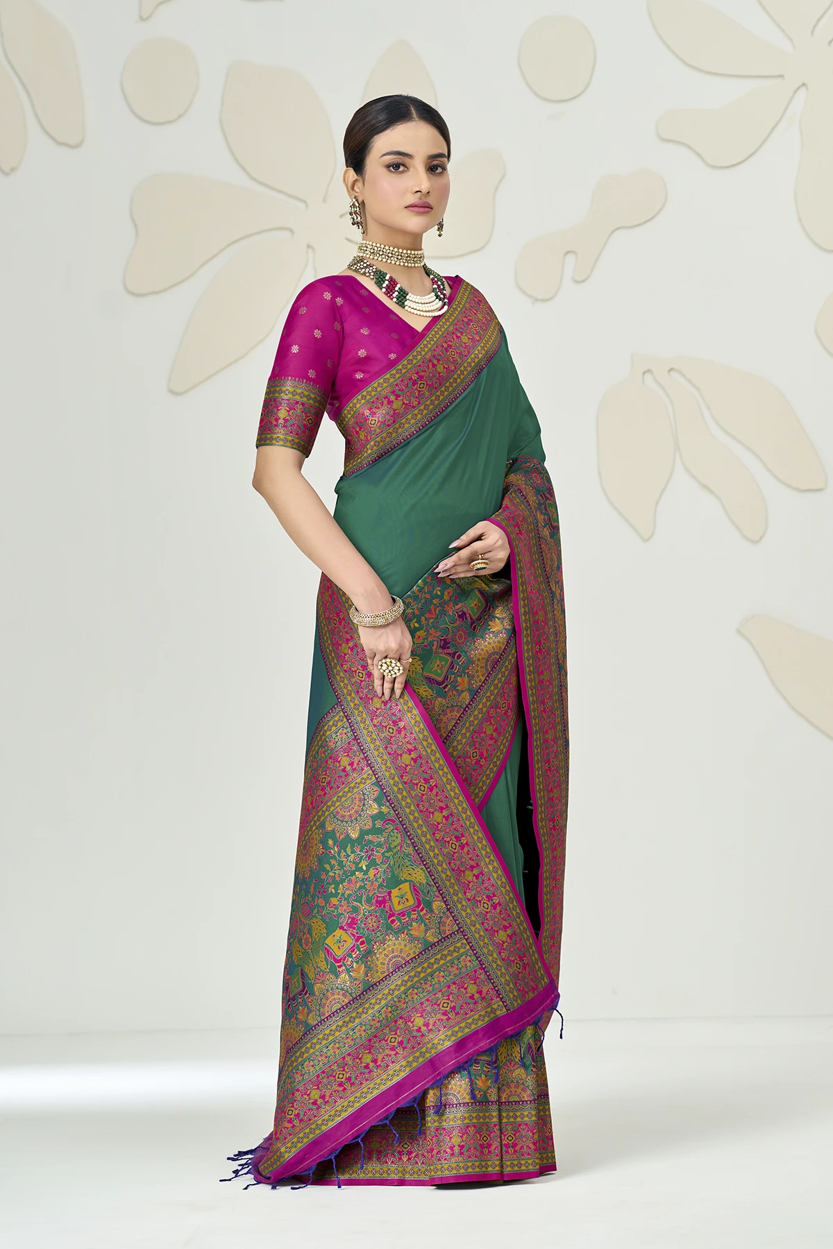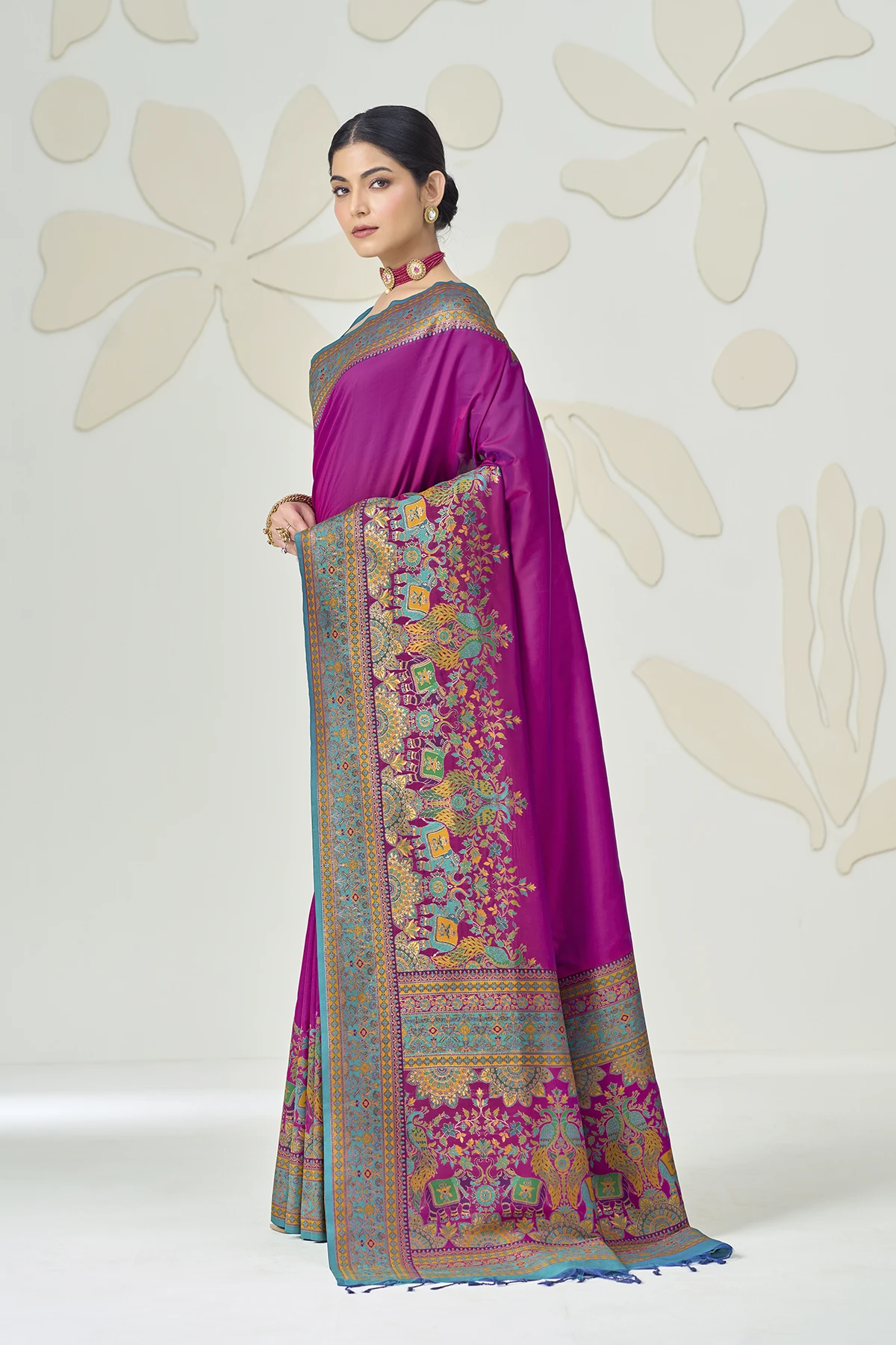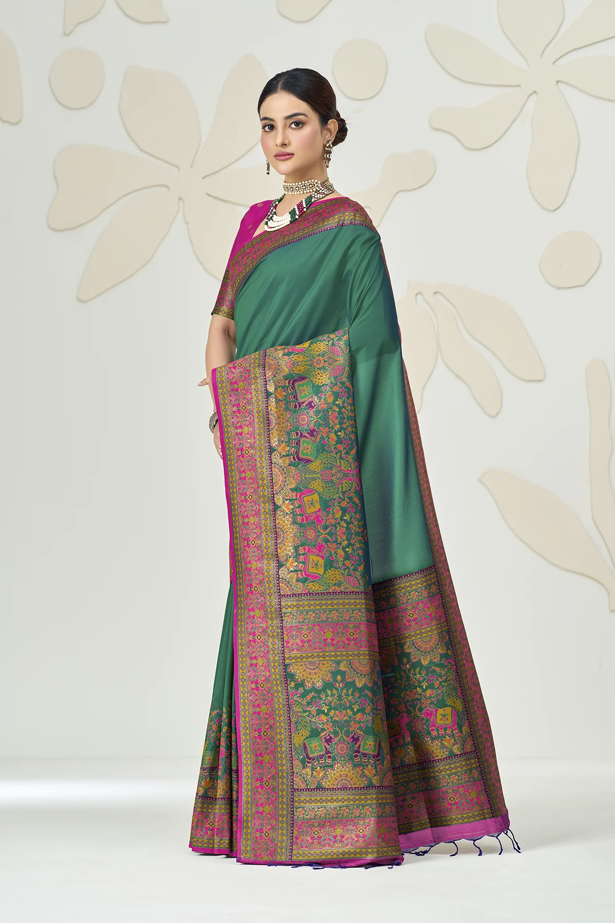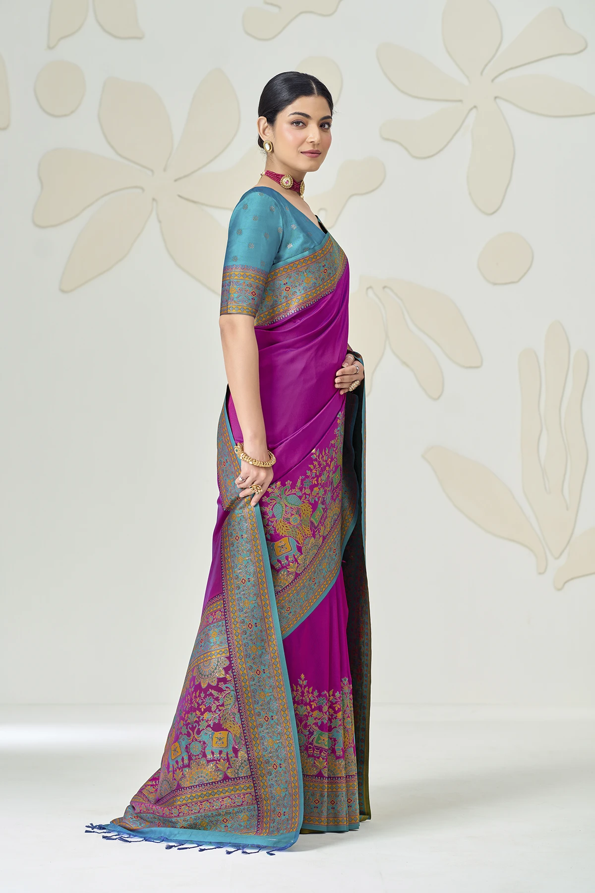 The true showstopper is the heavy Kalamkari-style pallu, featuring regal elephant and peacock motifs woven in a rich palette of pink, turquoise, and gold. Paired with a contrasting fuchsia pink blouse that boasts an elegant back-tie detailing and matching sleeve borders, this saree is designed to make a statement at weddings, receptions, and gala events.