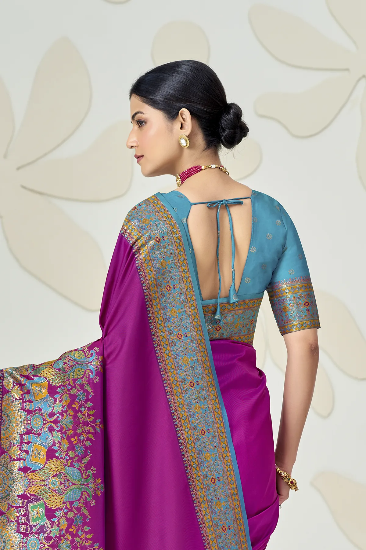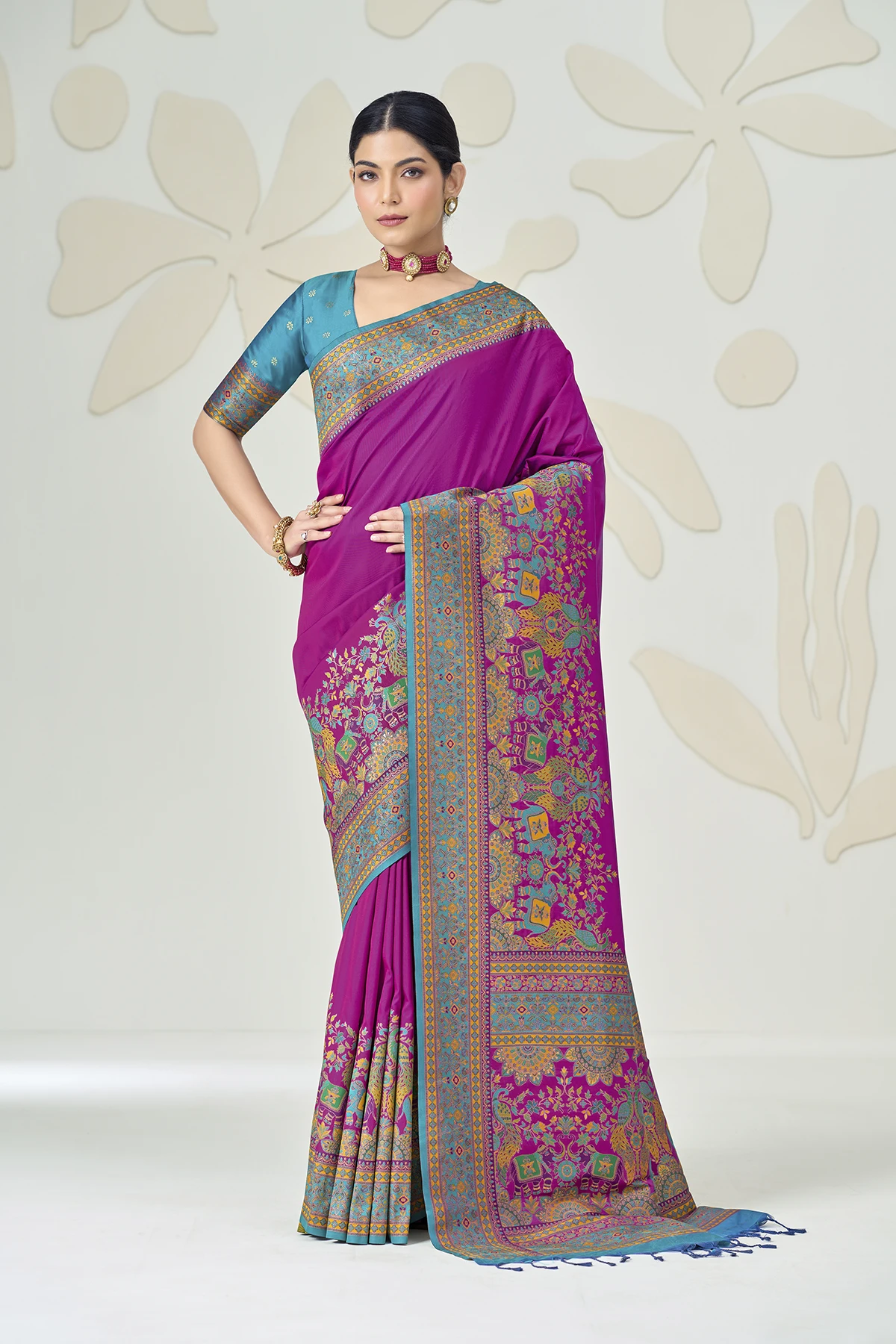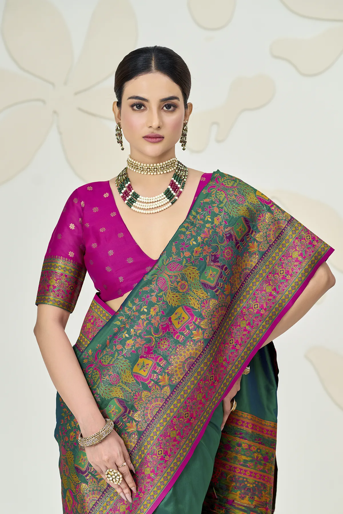 The true showstopper is the heavy Kalamkari-style pallu, featuring regal elephant and peacock motifs woven in a rich palette of pink, turquoise, and gold. Paired with a contrasting fuchsia pink blouse that boasts an elegant back-tie detailing and matching sleeve borders, this saree is designed to make a statement at weddings, receptions, and gala events.
