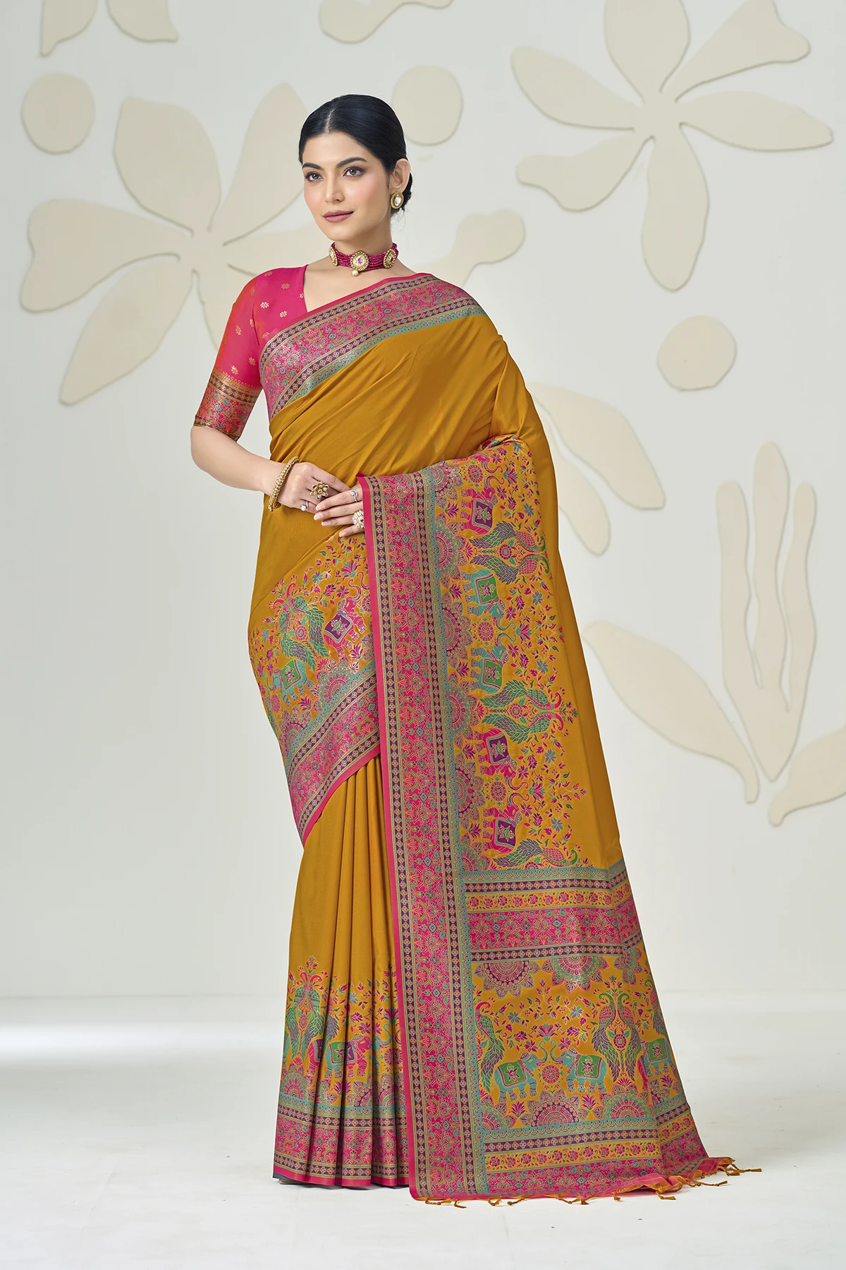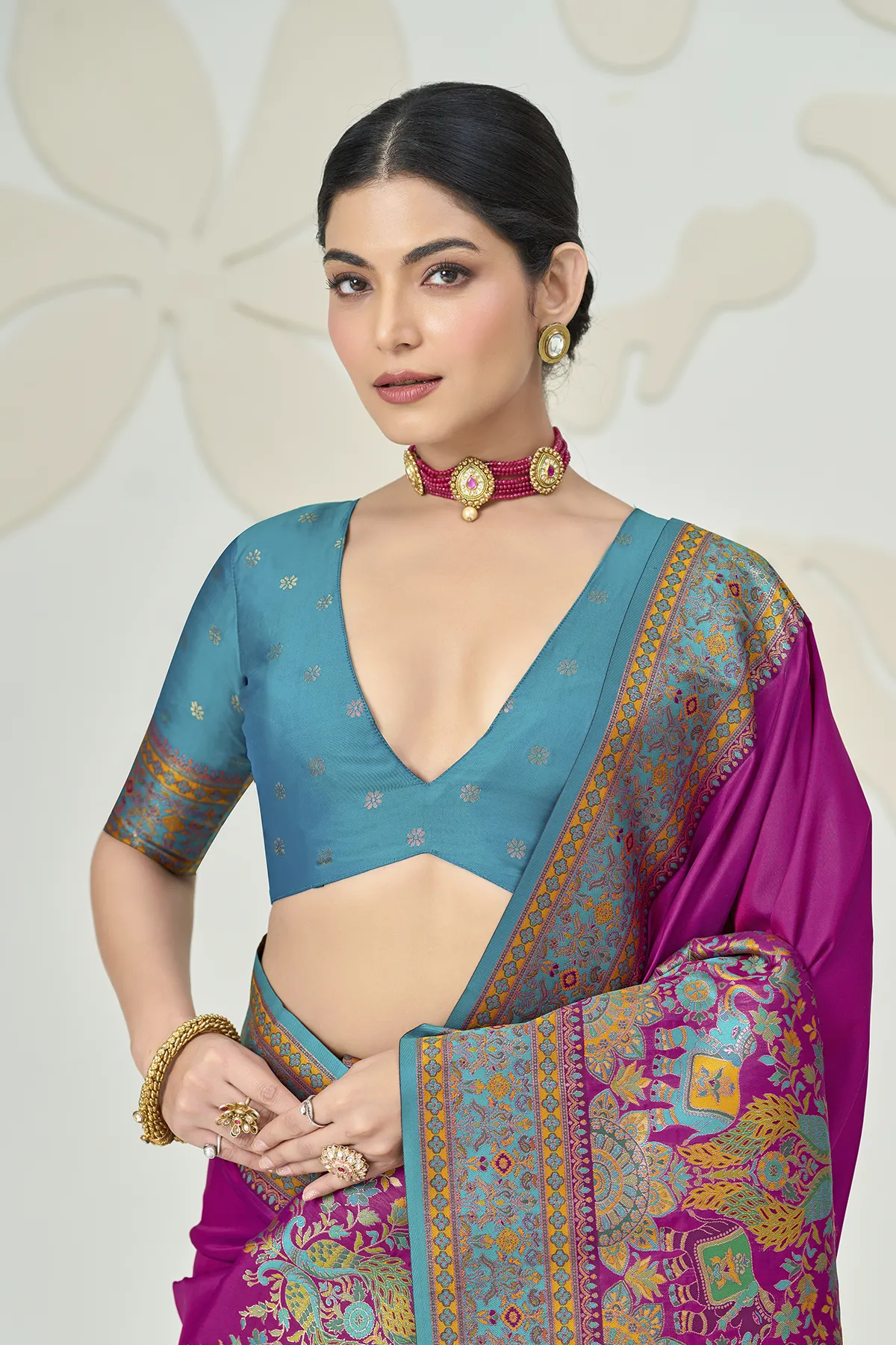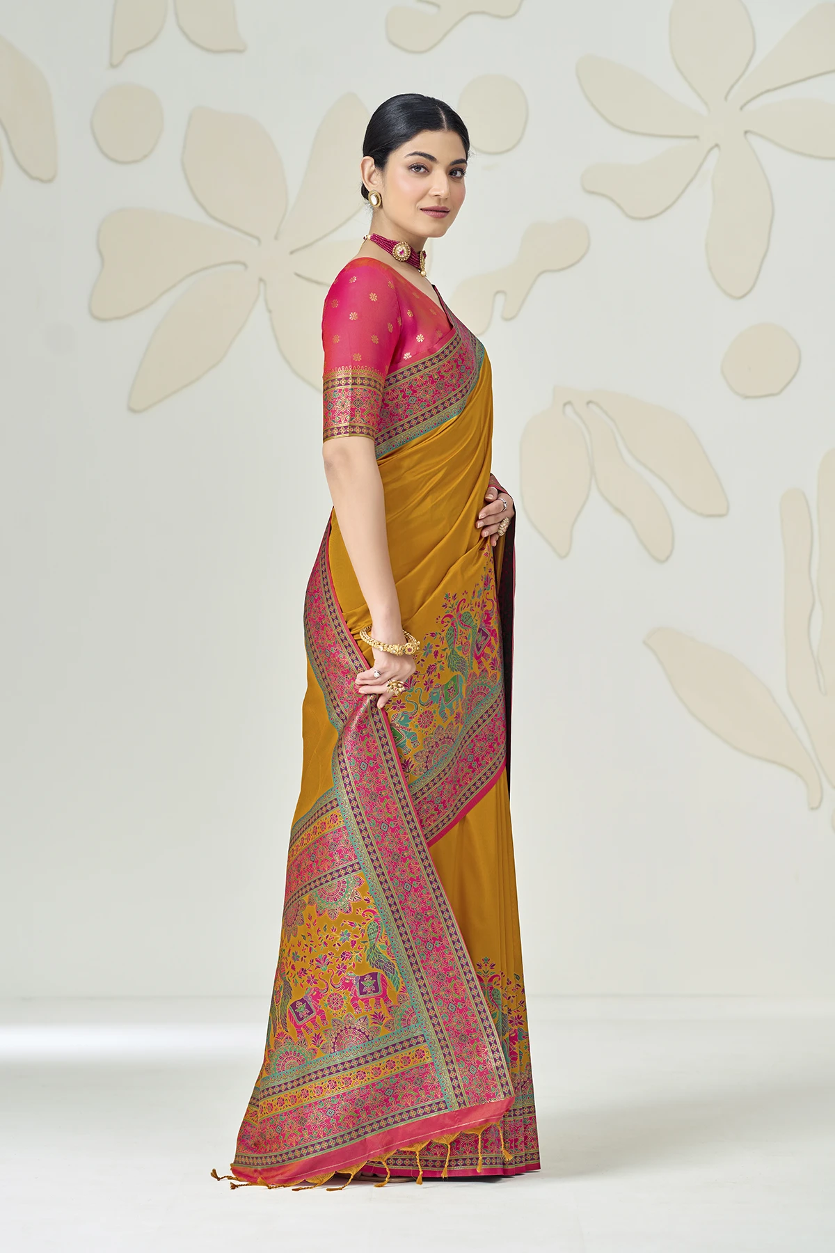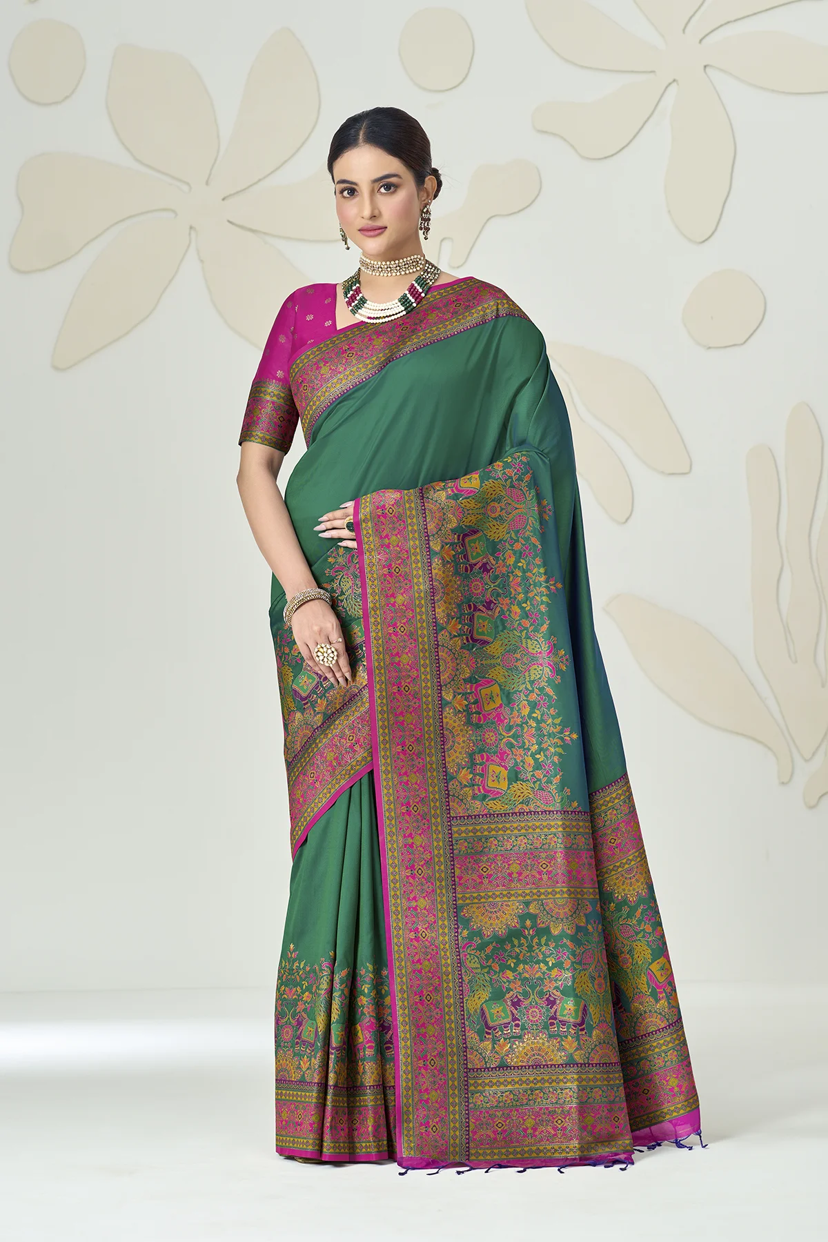 The true showstopper is the heavy Kalamkari-style pallu, featuring regal elephant and peacock motifs woven in a rich palette of pink, turquoise, and gold. Paired with a contrasting fuchsia pink blouse that boasts an elegant back-tie detailing and matching sleeve borders, this saree is designed to make a statement at weddings, receptions, and gala events.