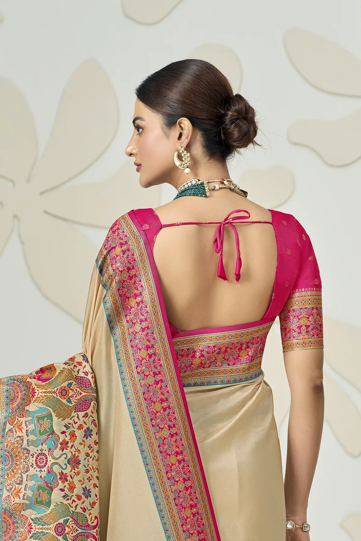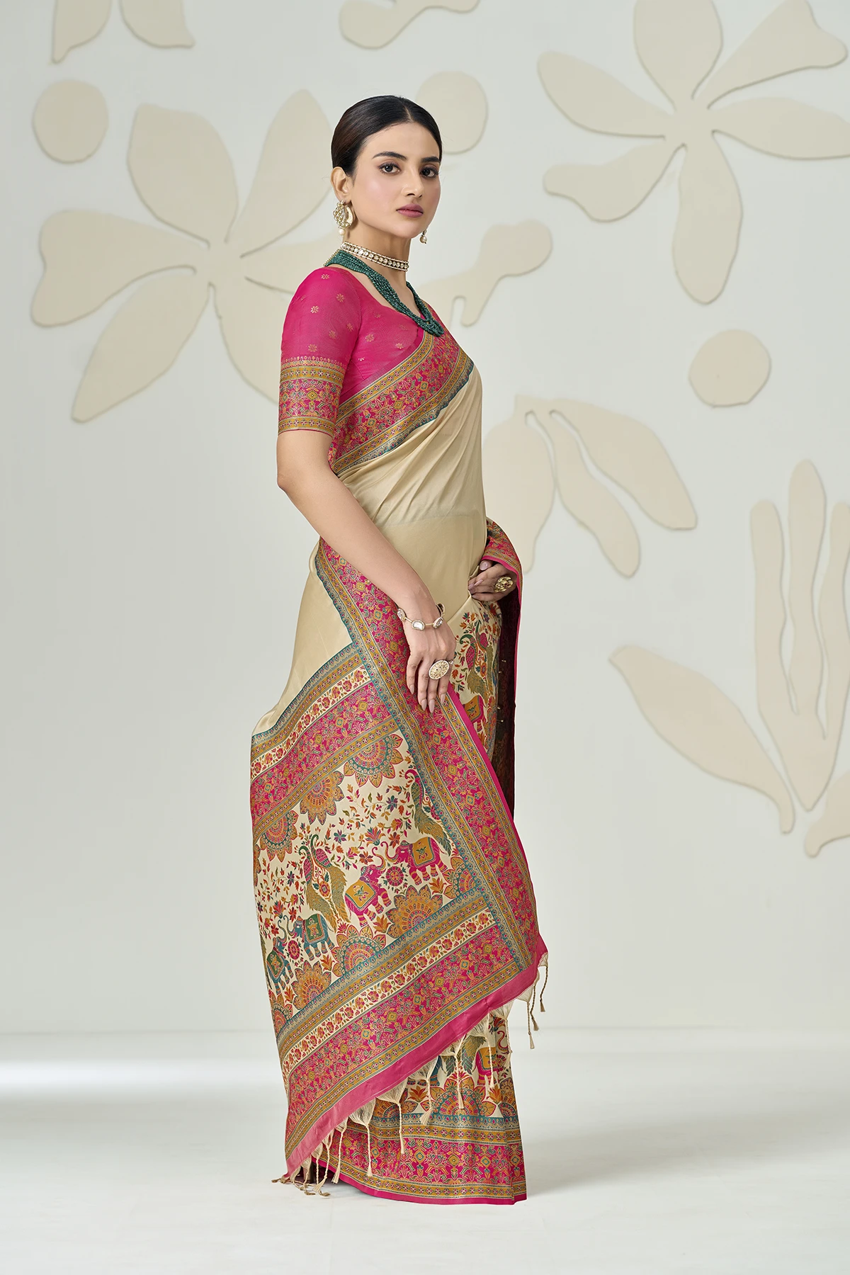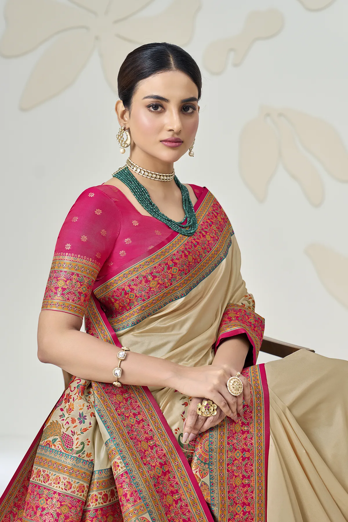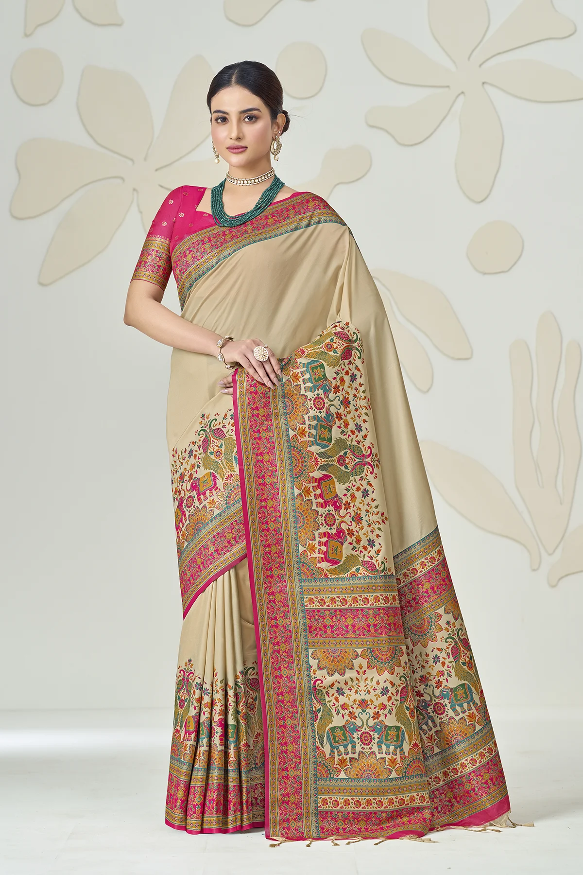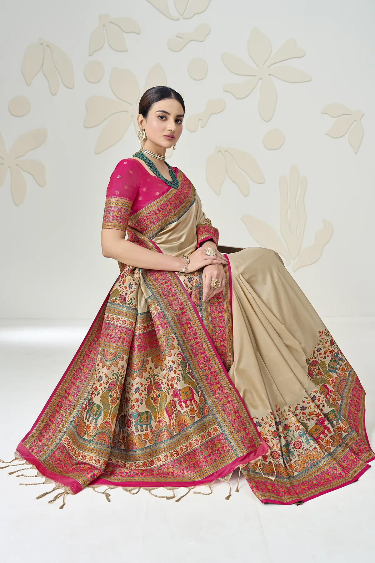 Redefine traditional grace with this stunning Beige Silk Saree, a masterpiece that balances minimalist charm with maximalist detailing. The saree features a smooth, lustrous beige body that serves as a canvas for the vibrant Rani Pink borders, adorned with intricate floral and geometric patterns.