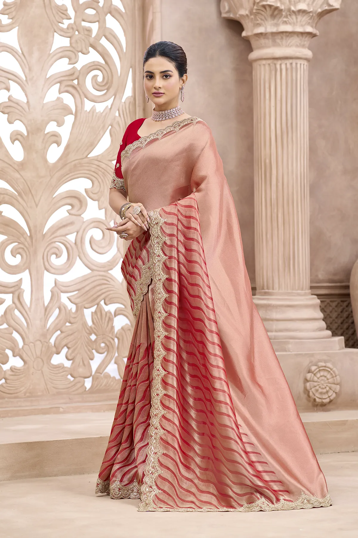 "Elevate your ethnic wardrobe with this exquisite Dual-Tone Metallic Silk Saree, a masterpiece of modern elegance and traditional charm. The saree features a sophisticated peach-copper metallic body that transitions into vibrant red wavy-patterned pleats, creating a dynamic visual appeal.