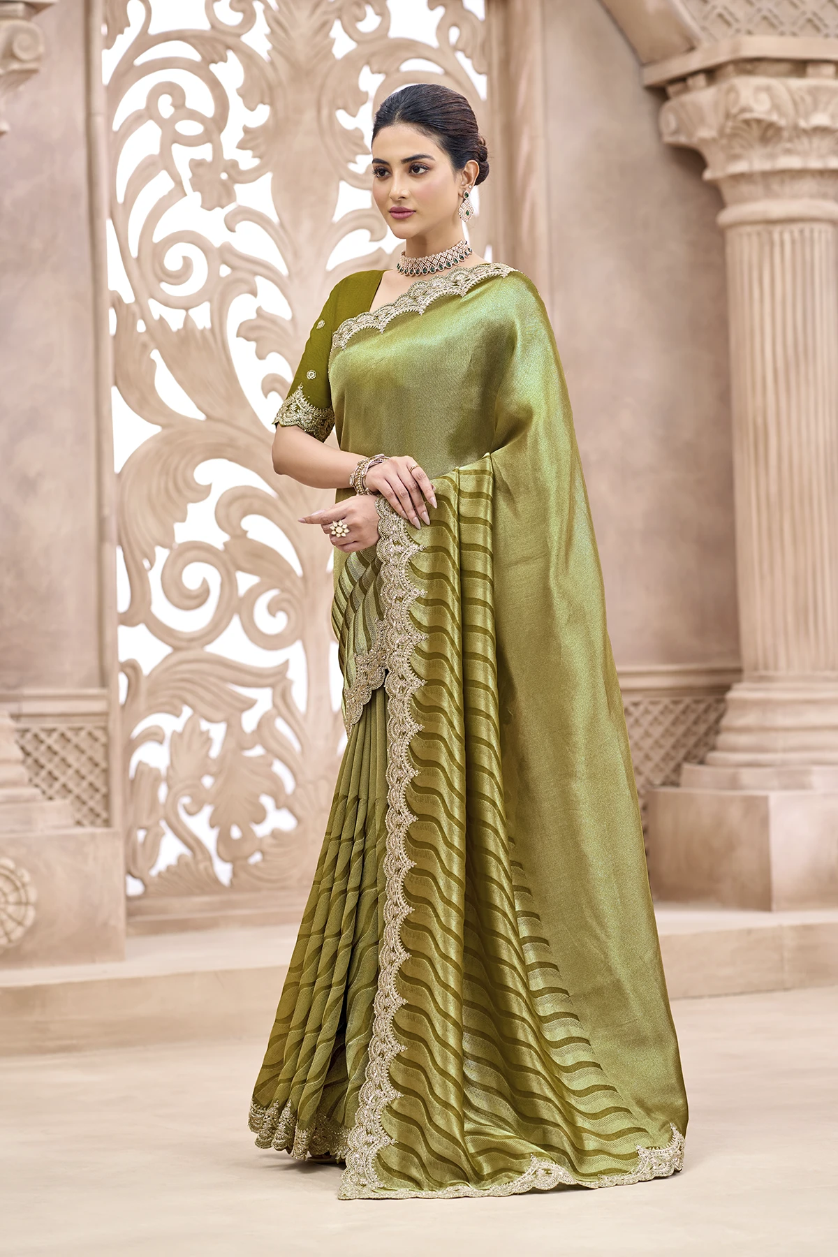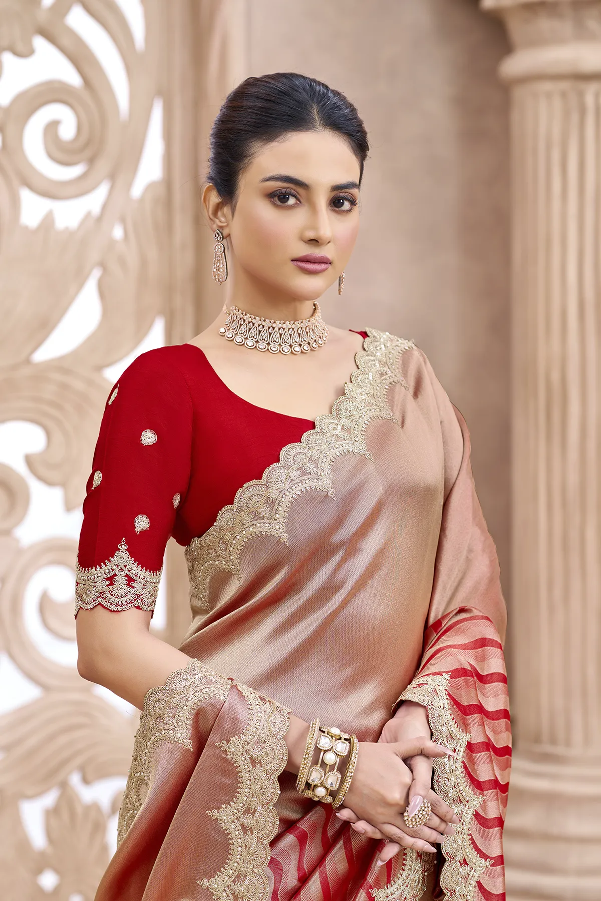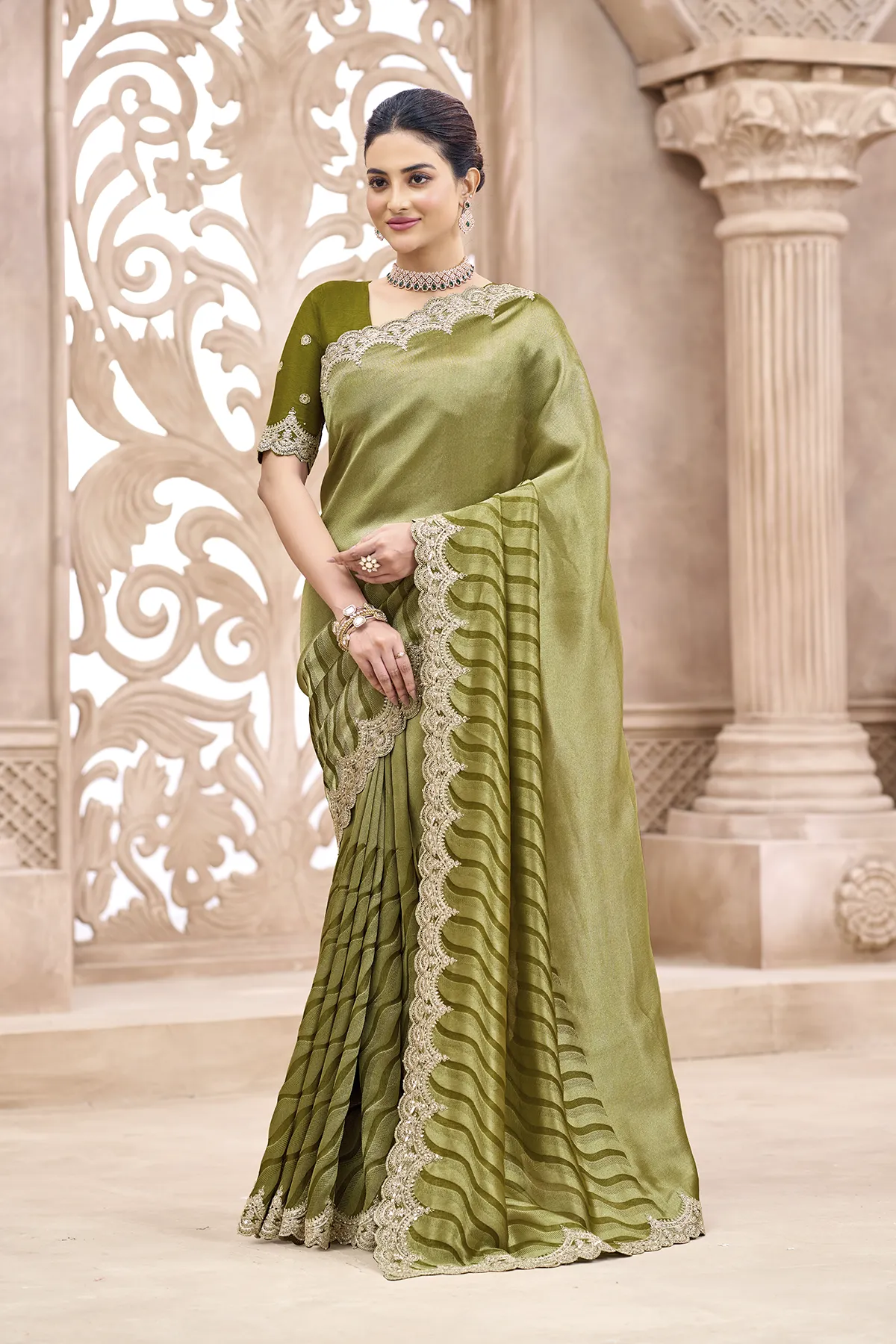 The highlight of this drape is the intricate gold Zari scalloped border that frames the saree with royal finesse. Paired with a contrasting deep red silk blouse featuring delicate embroidery and matching scalloped sleeve edges, this outfit is designed to make you the center of attention. Whether it’s a high-profile wedding or a festive gala, this saree promises a silhouette of pure grace."