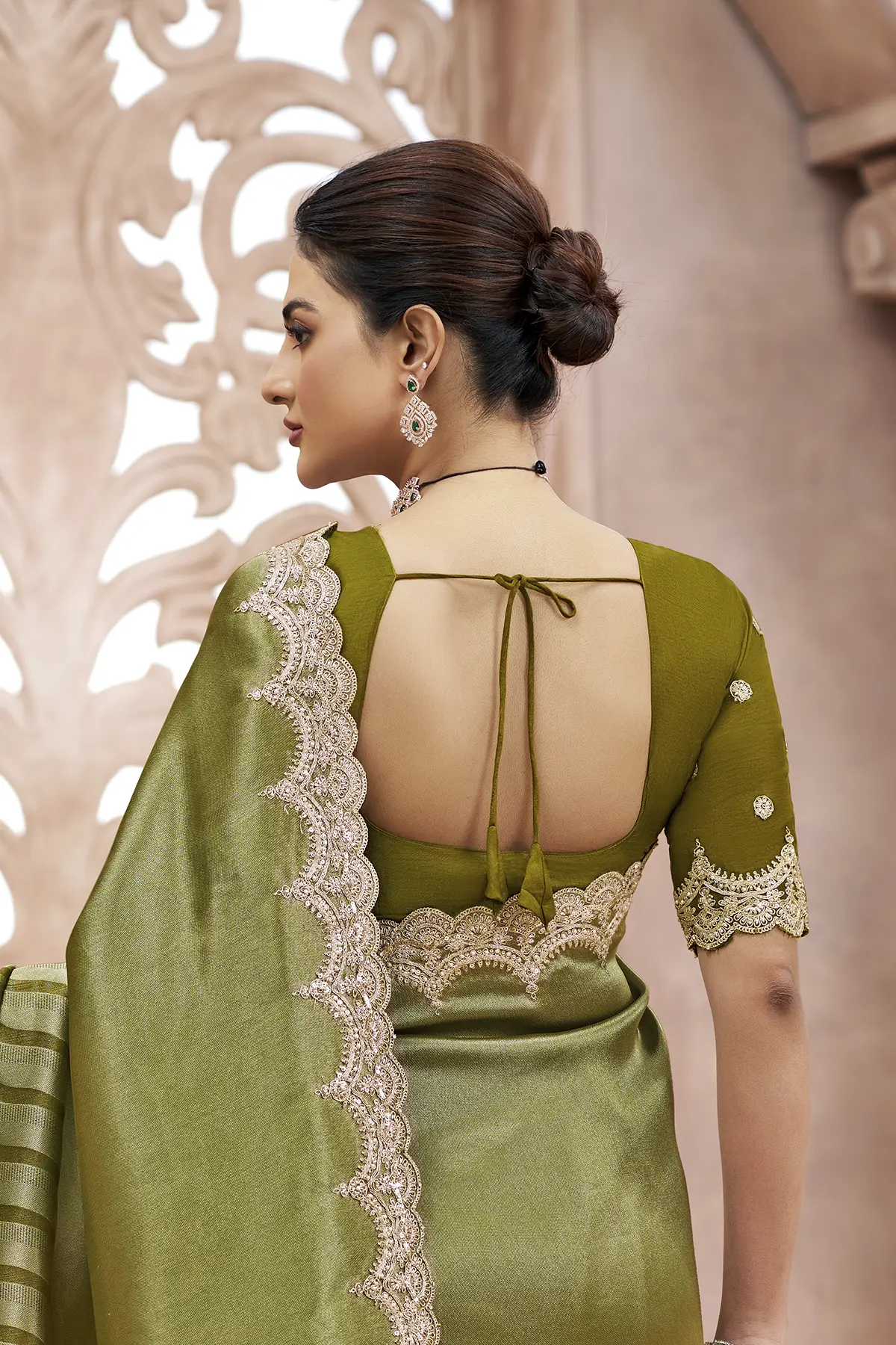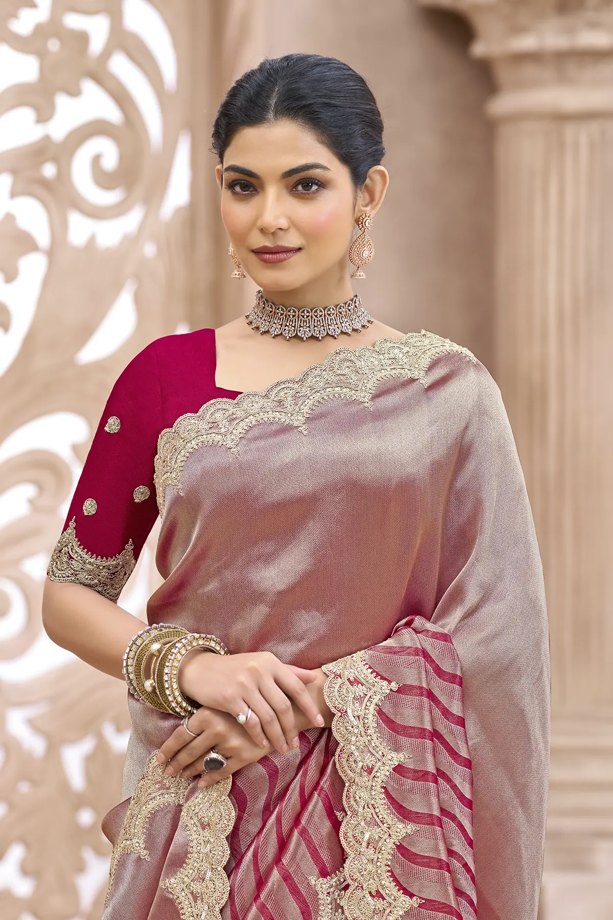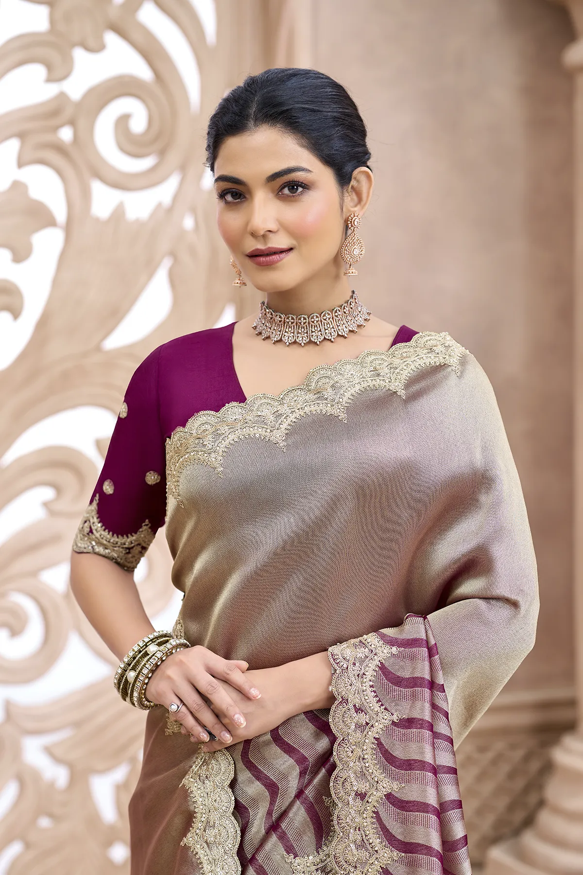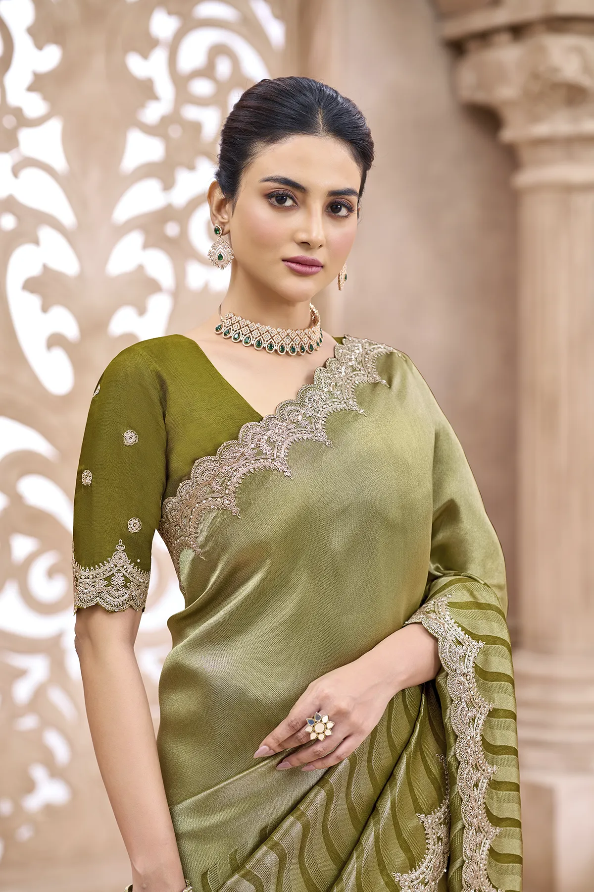 The highlight of this drape is the intricate gold Zari scalloped border that frames the saree with royal finesse. Paired with a contrasting deep red silk blouse featuring delicate embroidery and matching scalloped sleeve edges, this outfit is designed to make you the center of attention. Whether it’s a high-profile wedding or a festive gala, this saree promises a silhouette of pure grace."