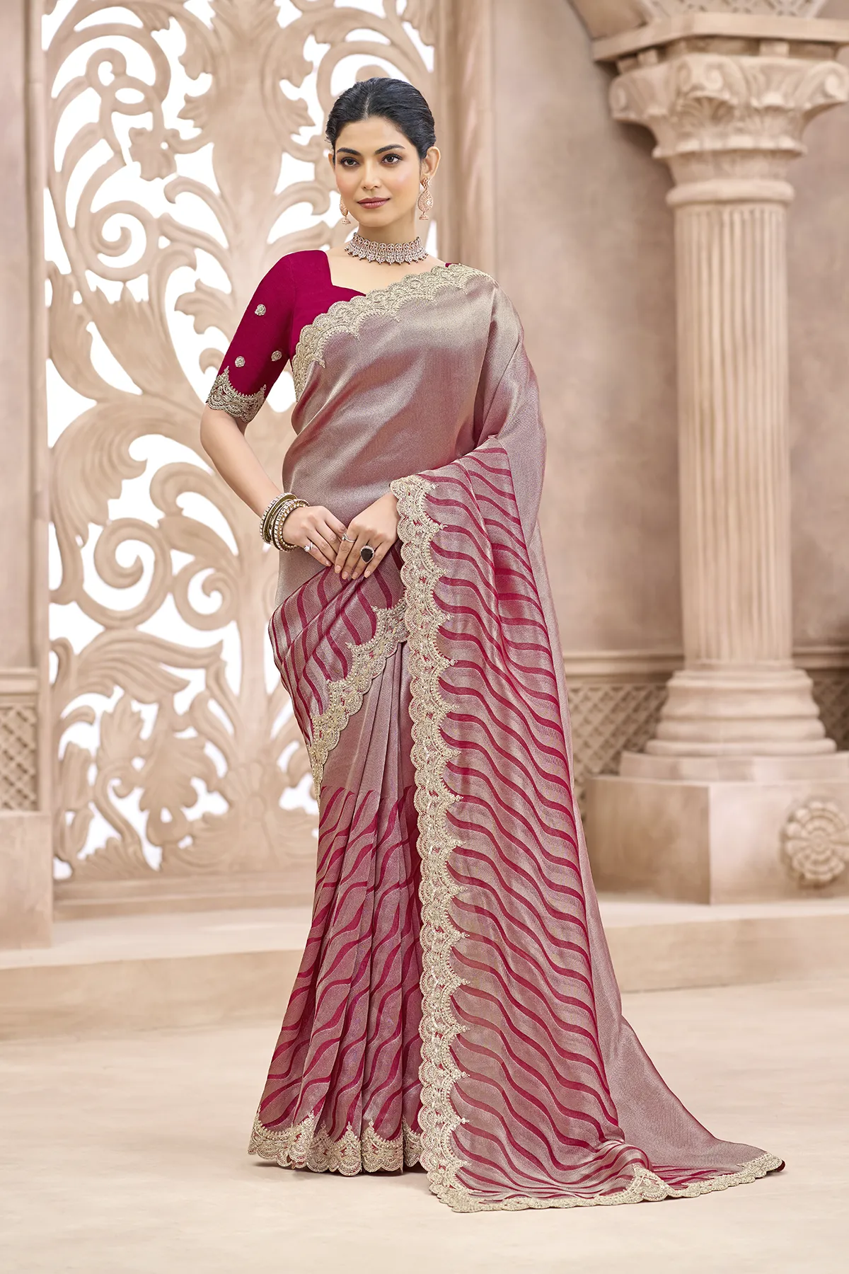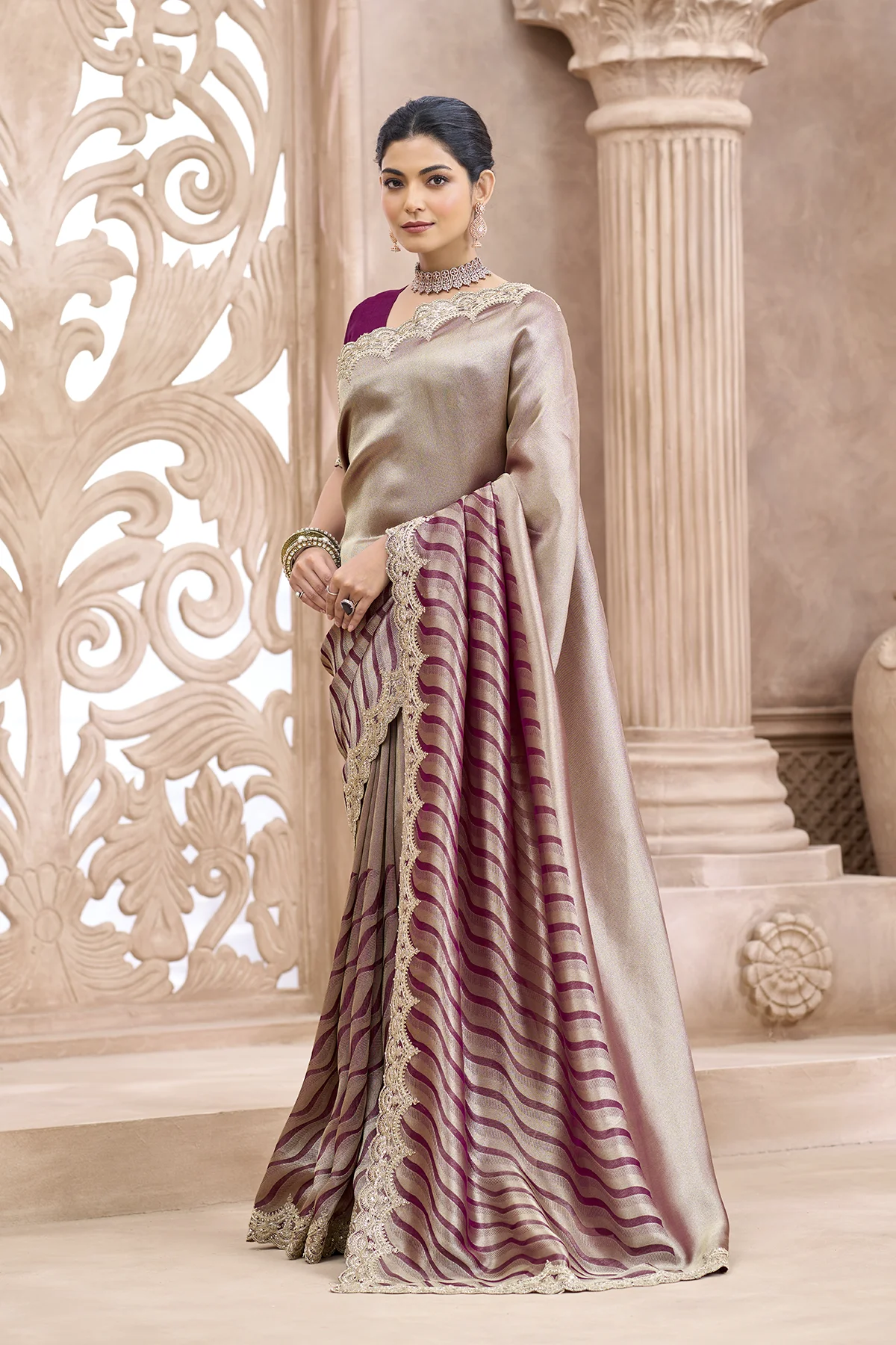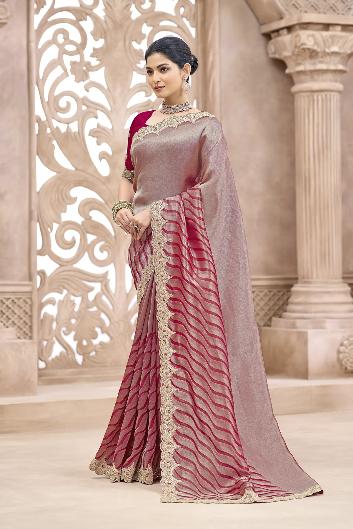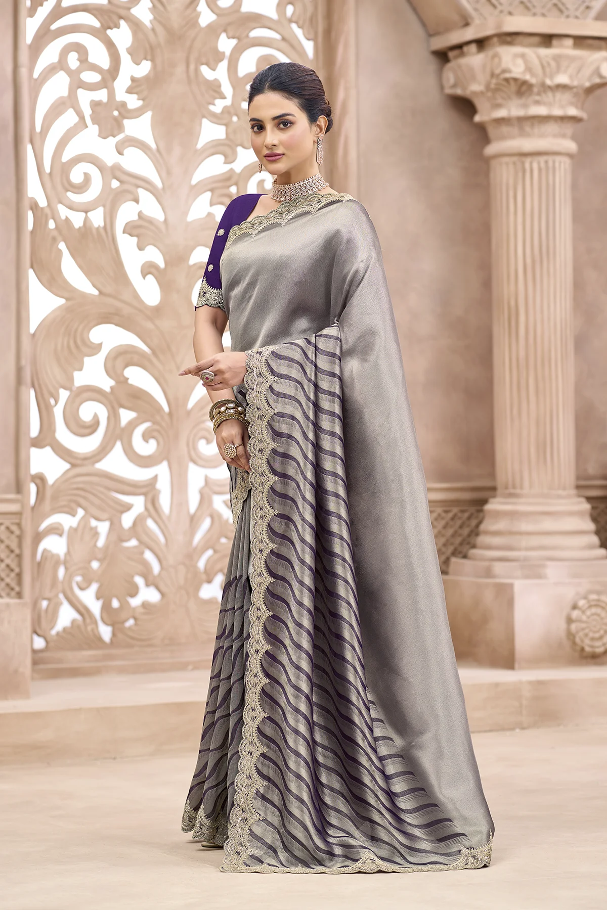 | Pattern | Solid Metallic on Palla, Waves (Leheriya-inspired) on Pleats |