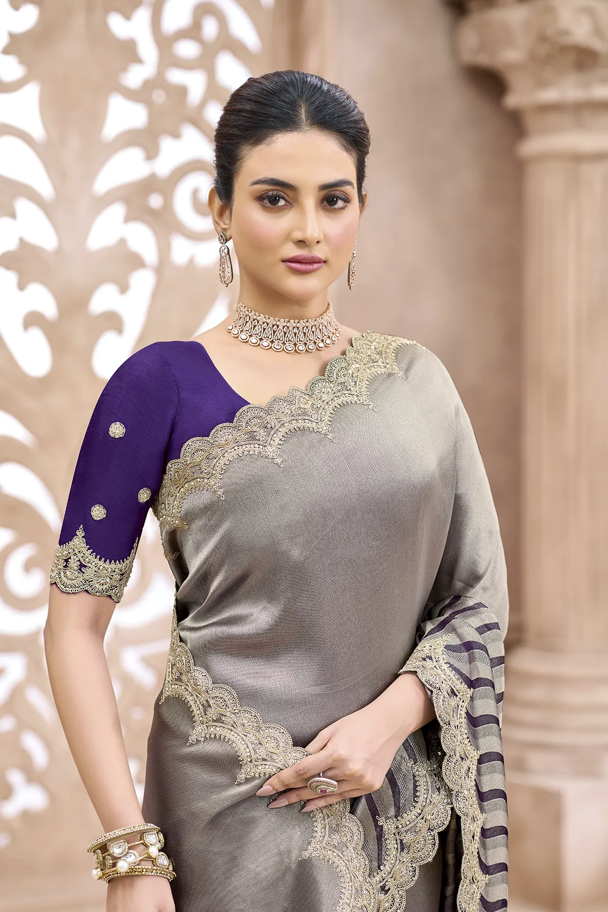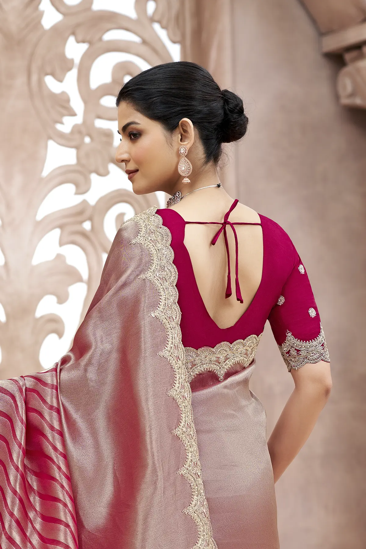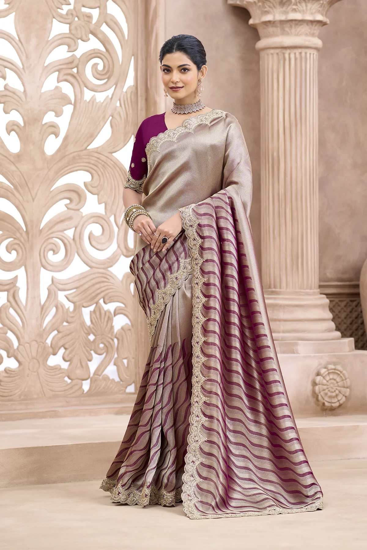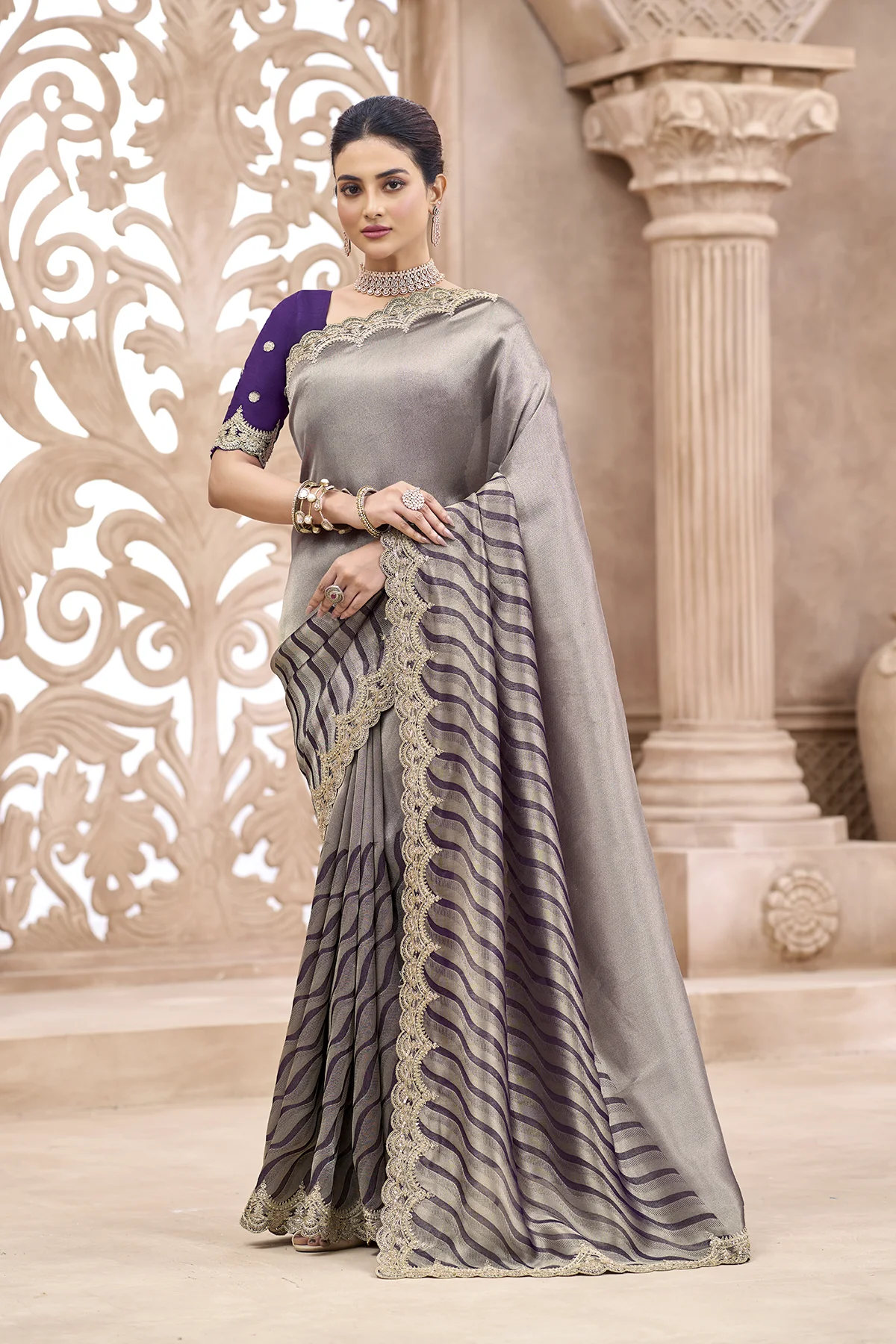 | Pattern | Solid Metallic on Palla, Waves (Leheriya-inspired) on Pleats |