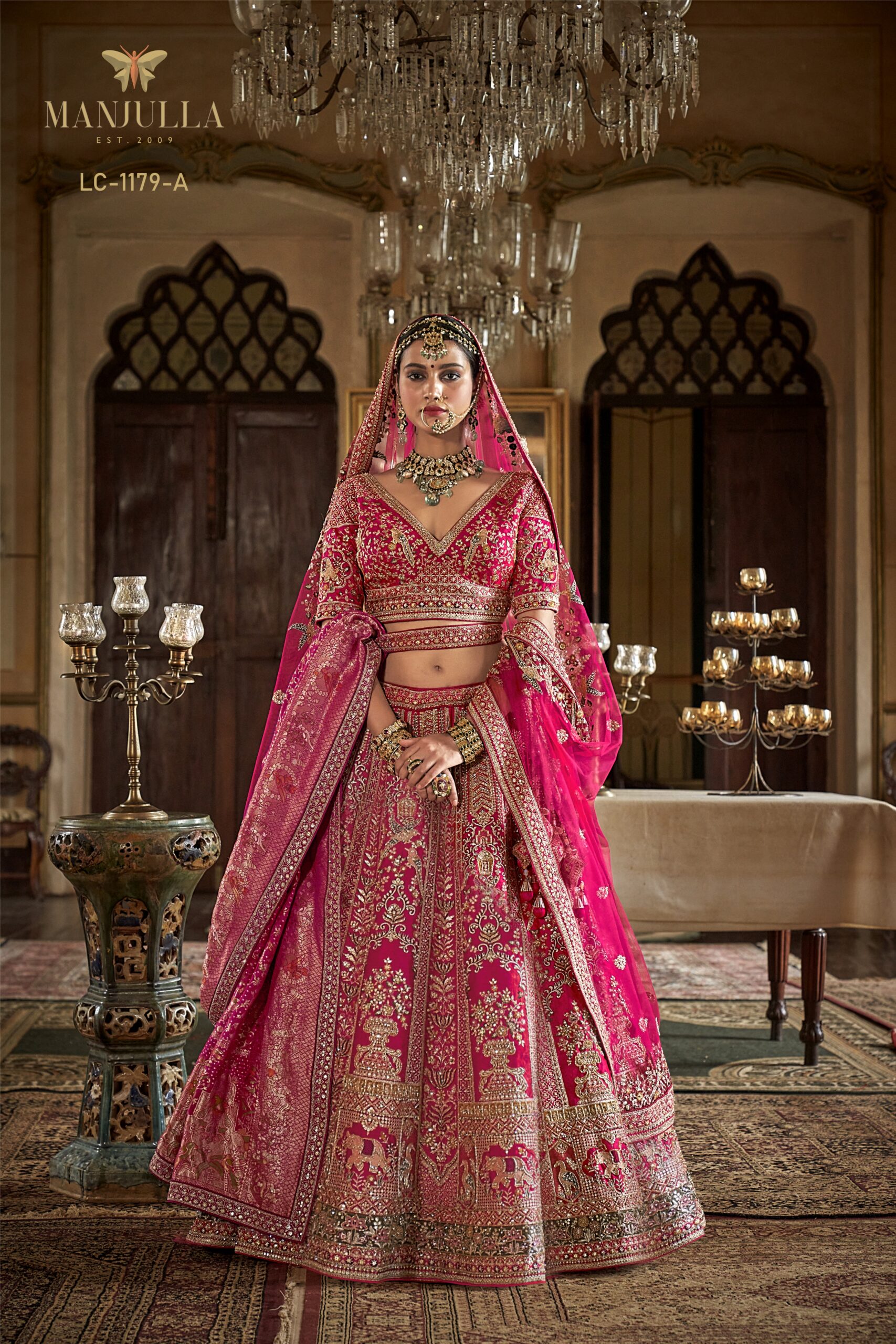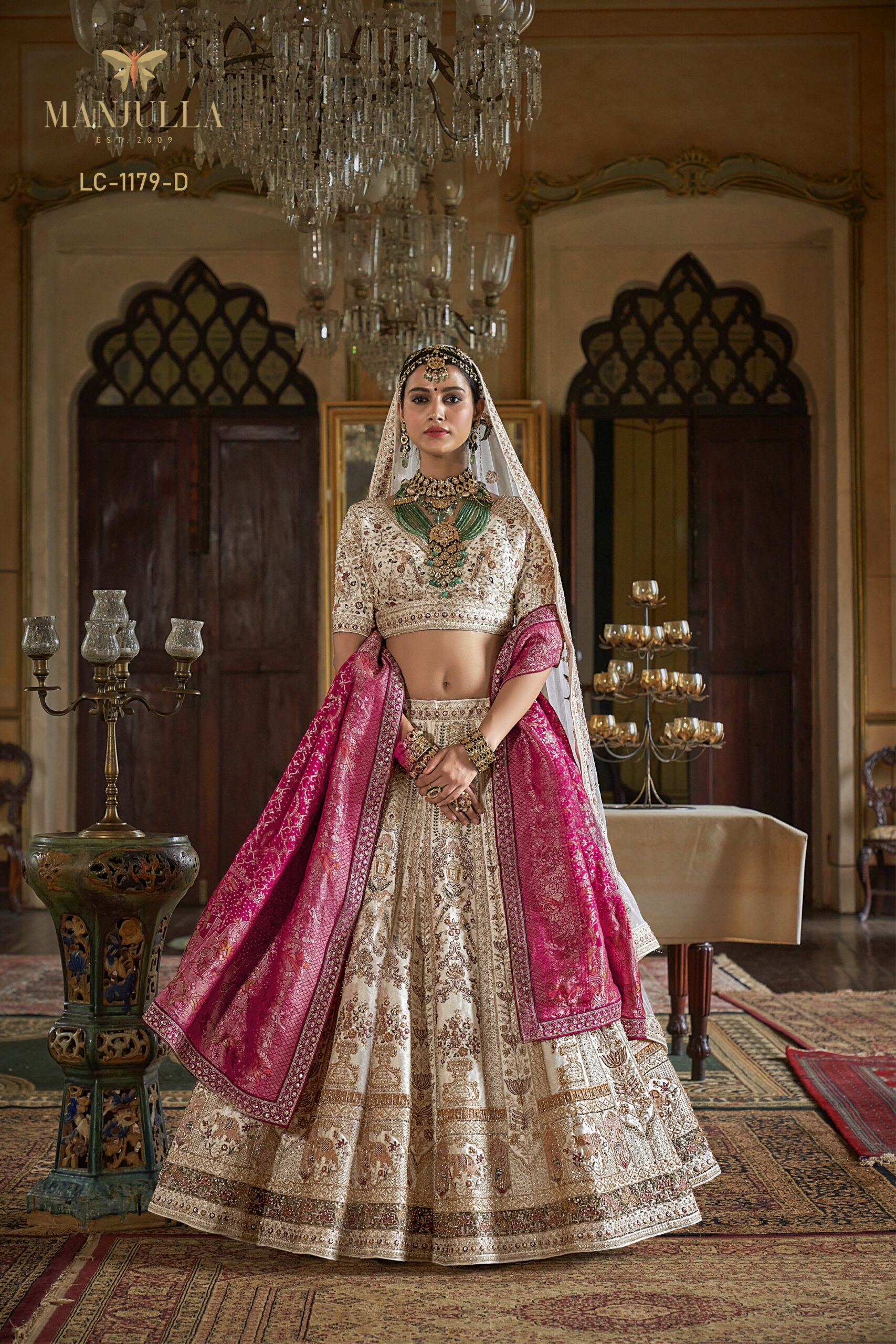 Embrace the pinnacle of bridal luxury with this magnificent Rani Pink Lehenga Choli from the renowned Manjulla Dulhan Vol-4 collection. This ensemble is a celebration of Indian heritage, featuring a silk lehenga meticulously adorned with ornate Dori and Zari work, intricately woven with floral and traditional motifs.