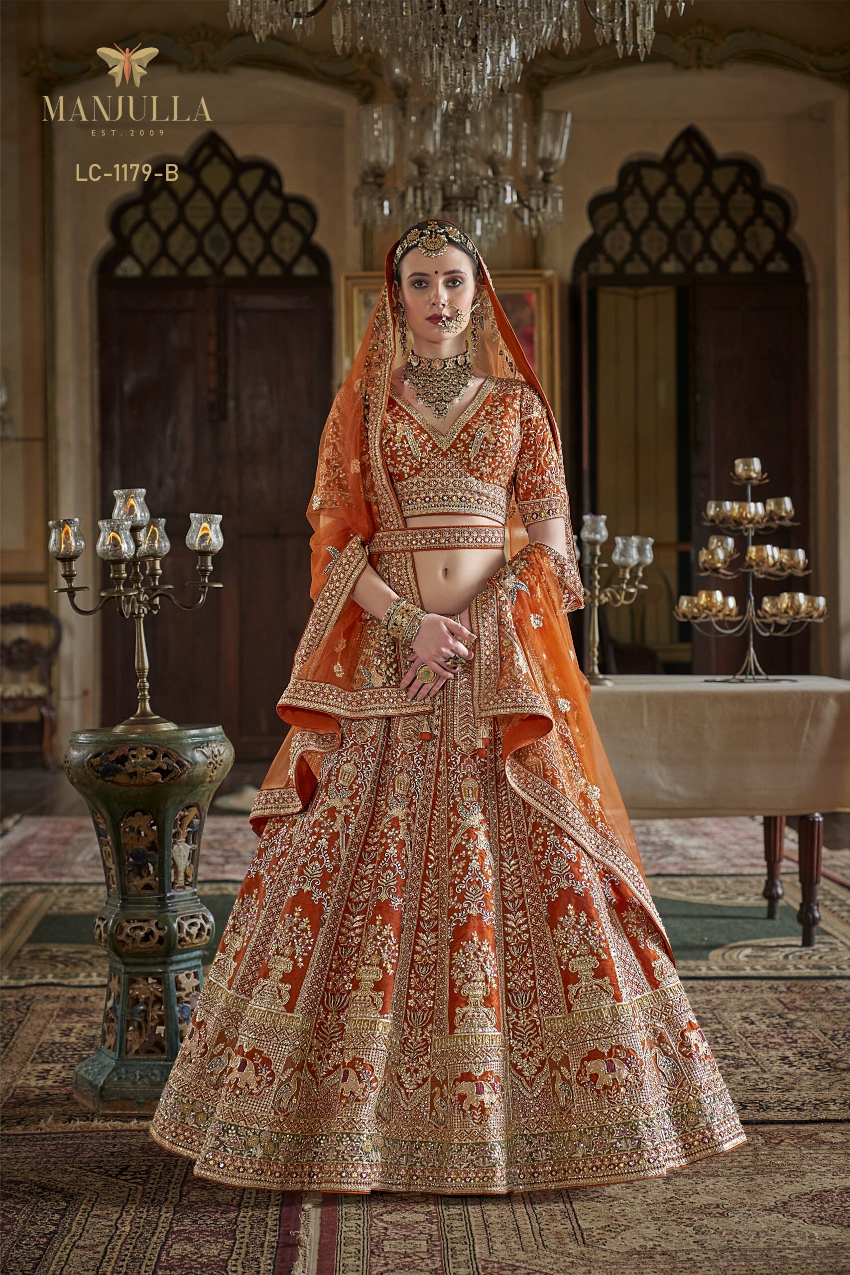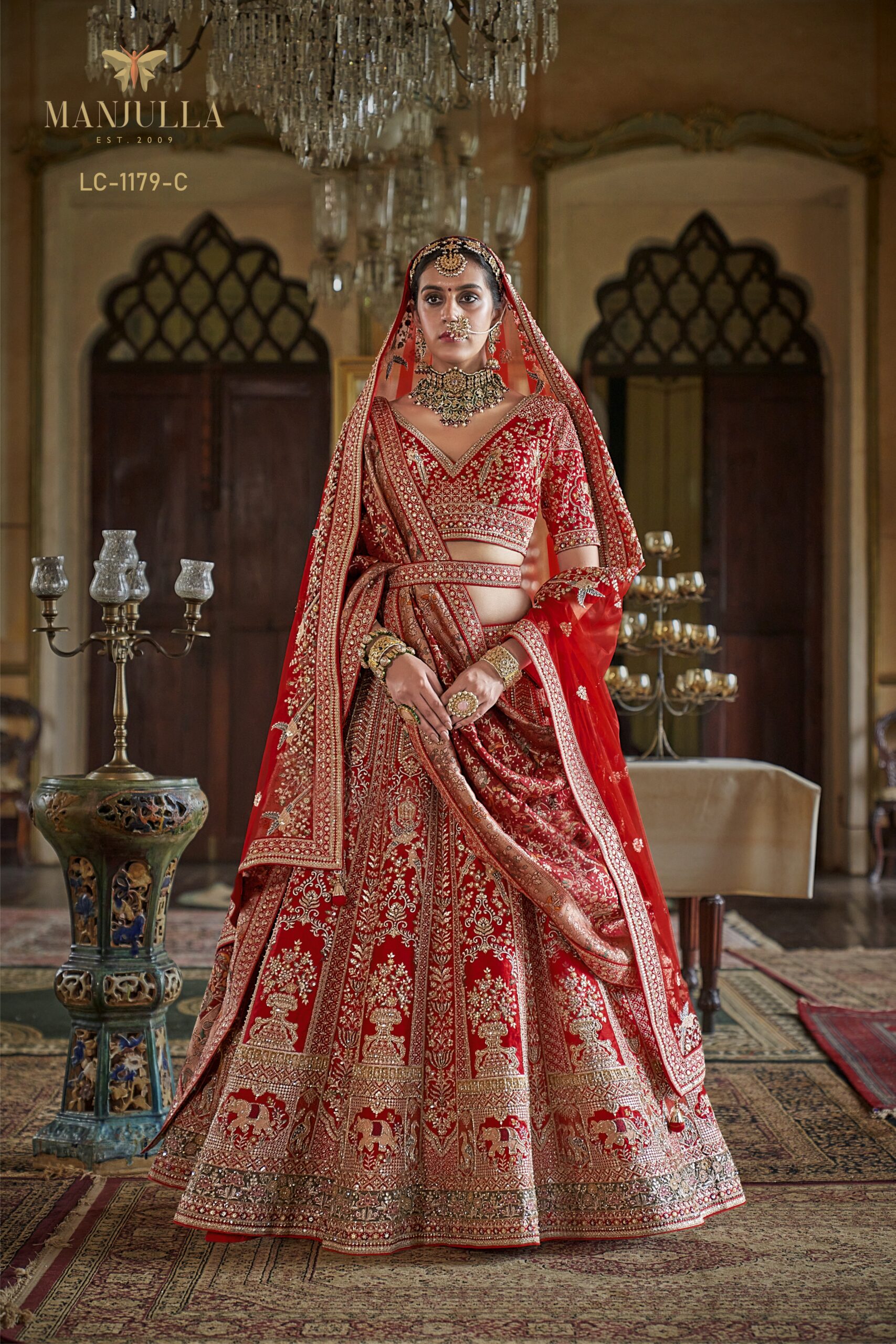 The ensemble includes a heavily embroidered V-neck choli with a matching waist-belt detail and a sheer, lightweight dupatta with wide embellished borders. Designed for the modern bride who treasures tradition, this masterpiece ensures a majestic presence on your most special day.