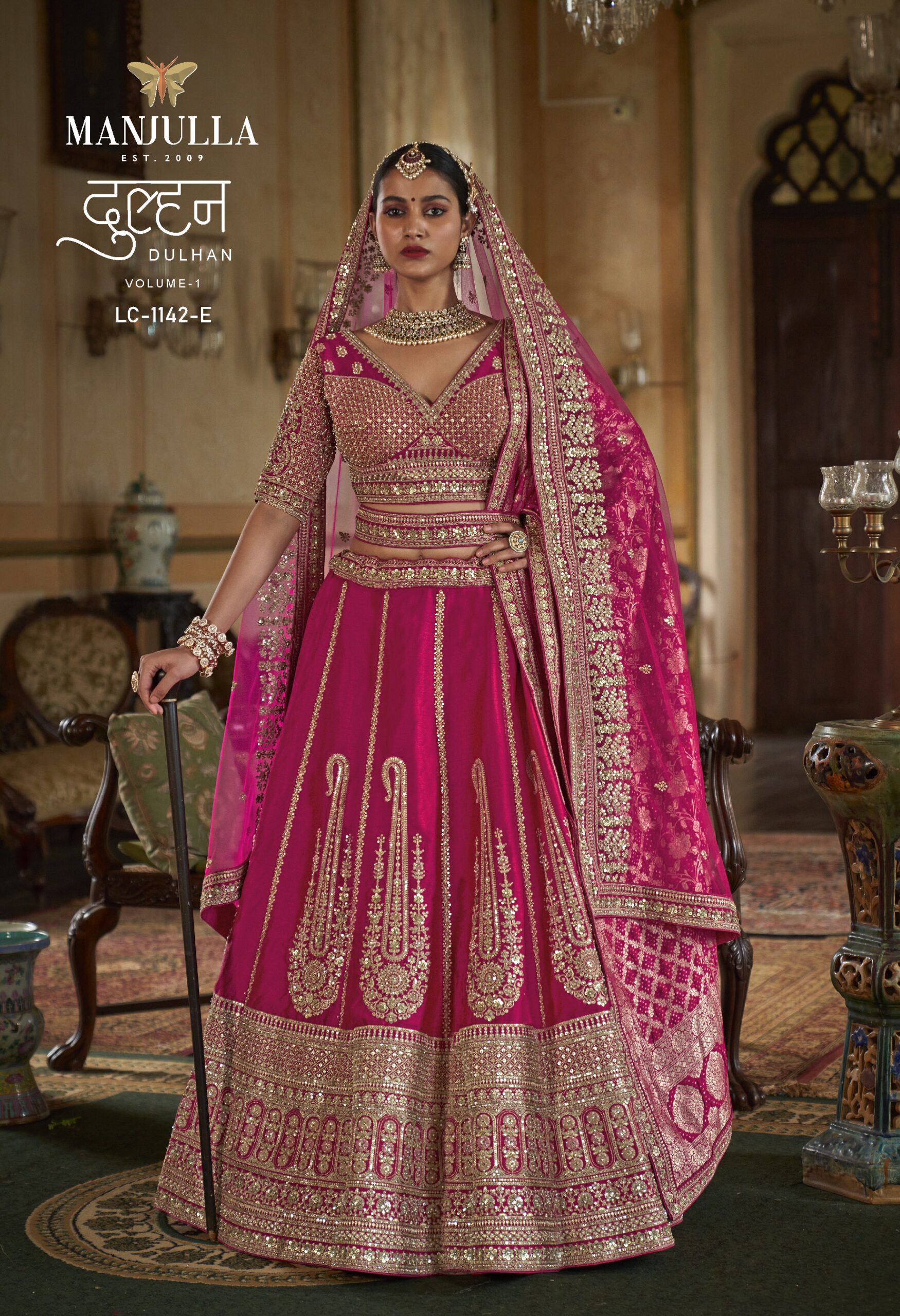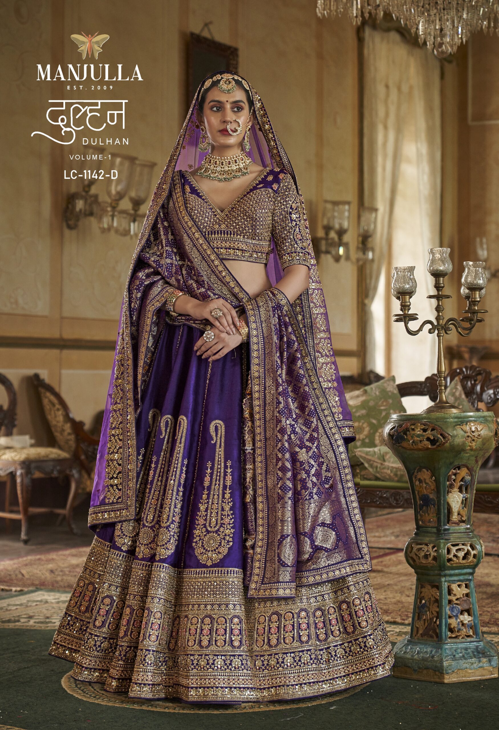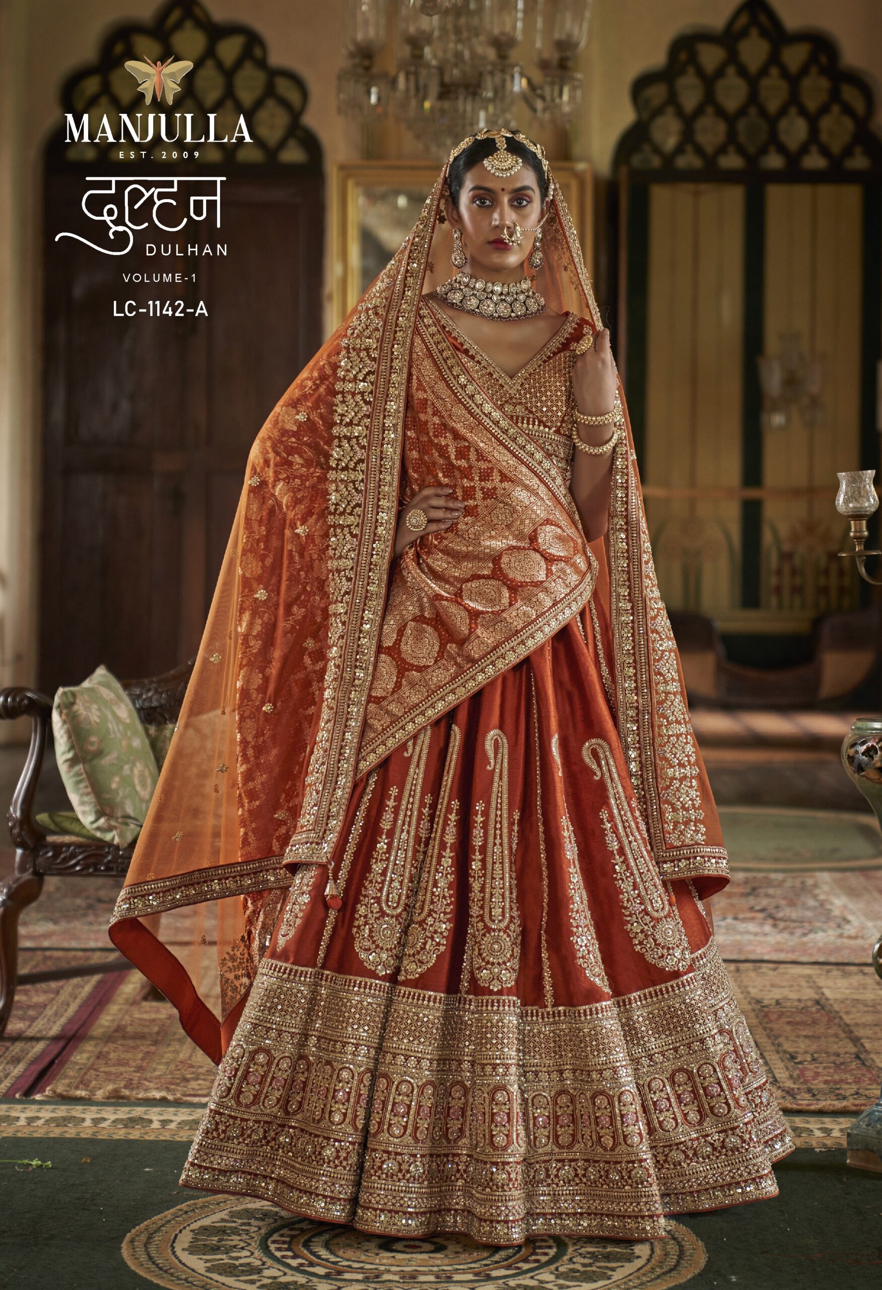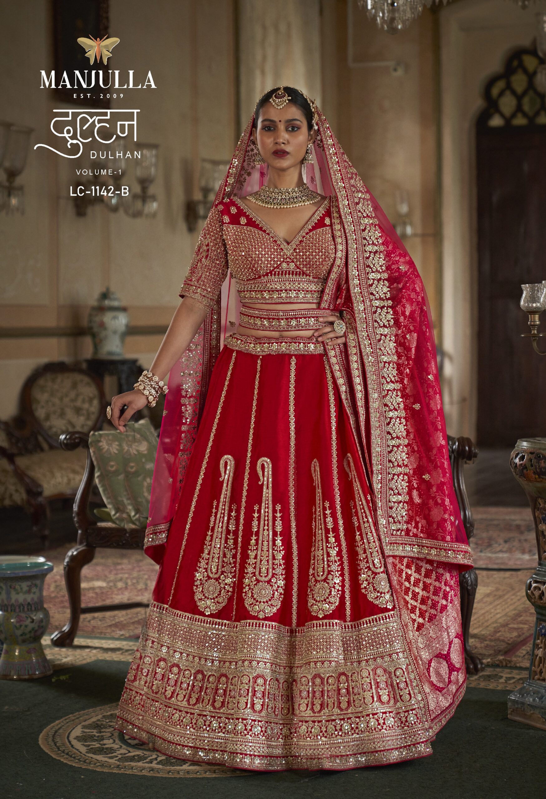 Embrace the timeless elegance of a traditional Indian bride with the Manjulla Dulhan LC-1142. This masterpiece from the Dulhan Volume-1 collection is designed for the woman who wants to blend heritage with royalty.